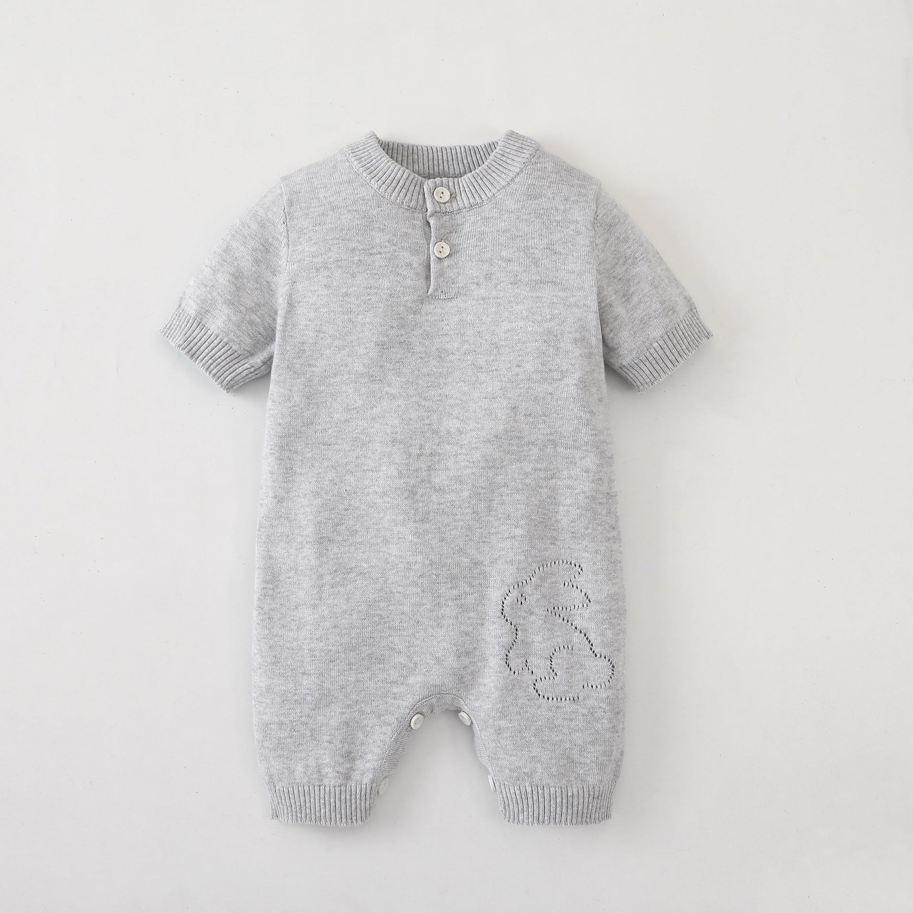 This knitted romper is perfect for baby's summer wardrobe. It is made with 100% cotton and includes an adorable hollow-out rabbit design. Soft and lightweight, your baby will love wearing this romper!Β